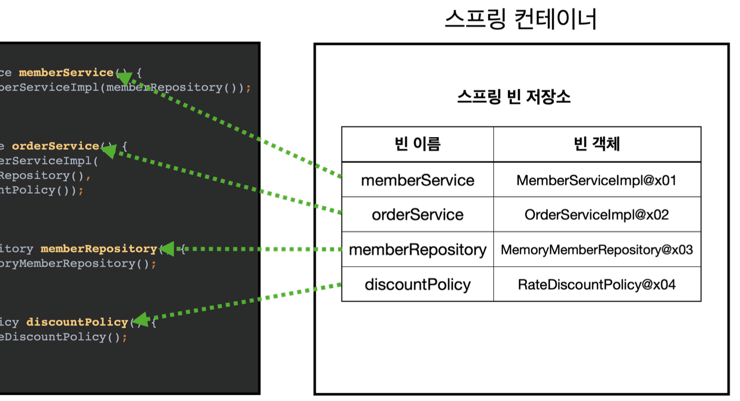 ์ปจํ ์ด๋๋ฅผ ์์ฑํ๋ค. ์คํ๋ง ์ปจํ ์ด๋ ๋ด์์ ๋น ์ด๋ฆ๊ณผ ๋น ๊ฐ์ฒด๋ฅผ ์ ์ฅํ์ฌ ๊ด๋ฆฌํด์ค๋ค. Public๊ณผ ํจ๊ป ์ด ๊ฒ์ ํ์ ๊ณผ ์ด๋ฆ์ด ๋๋ค. ์์๋ก public MemberService memberService( )์ ๊ฒฝ์ฐ MemberService๋ ํ์ ์ด ๋๊ณ memberService๋ ๋น์ ์ด๋ฆ์ด ๋๋ค. return new์ ํจ๊ป ์ฐ์ด๋ฉด ๋น ๊ฐ์ฒด๊ณผ ๋๋ค. ์๋ก return MemberServiceImpl(memberRepository( ))์ ๊ฒฝ์ฐ MemberServiceImpl์ด ๋น ๊ฐ์ฒด๊ฐ ๋๋ ๊ฒ์ด๋ค. ๊ทธ๋ ๊ฒ ์คํ๋ง ์ปจํ ์ด๋์ ์ ์ฅ๋์ด ๊ด๋ฆฌ๋๋ค. ๊ทธ๋ฆฌ๊ณ ์ด๋ฒ์ ๋น์ด ์ ๋๋ก ๋ฑ๋ก๋์ด์๋์ง ํ์ธํ๋ ๋ฐฉ๋ฒ์ ๋ฐฐ์ธ ๊ฒ์ด๋ค.