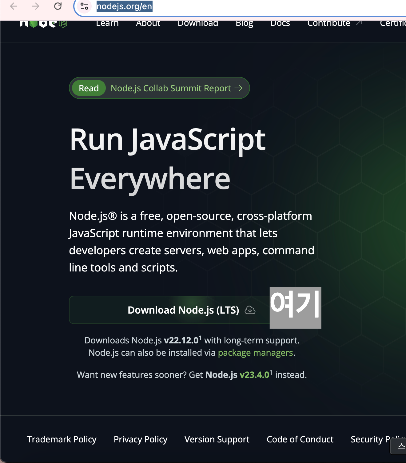 ๐Node.js๋? - Node.js๋ Chrome V8 JavaScript ์์ง์ผ๋ก ๋น๋๋ JavaScript ๋ฐํ์์ ๋๋ค. ๐macOS์์ Node.js ์ค์น ๋ฐฉ๋ฒ 1. ์ฌ์ดํธ (https://nodejs.org/en ) ์ ์ Node.js Node.js® is a JavaScript runtime built on Chrome's V8 JavaSc