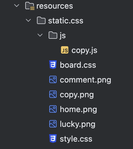 static๊ณผ css๊ฐ ๋ฐ๋ก ๋ถ๋ฆฌ๋๋์ง ๋ชจ๋ฅด๊ฒ ์ง๋ง, ์ผ๋จ ํ์ฌ ํ๋ก์ ํธ๋ ์ ์ ๋ก ํฉํด์ก๋ค. js ๋๋ ํ ๋ฆฌ๋ฅผ ๋ฐ๋ก ์๋ง๋ค๊ณ css์ ๊ฐ์ด ๋ฃ์ด์ ๊ทธ๋ฐ๊ฑด์ง ์ด๋ฐ์ ๊ฒฝ๋ก ์ธ์์ ์ ๋ชปํ๋ค. ๊ทธ๋์ js ๋๋ ํ ๋ฆฌ ํ์์ copy.js๋ฅผ ๋ฃ์๋ค.