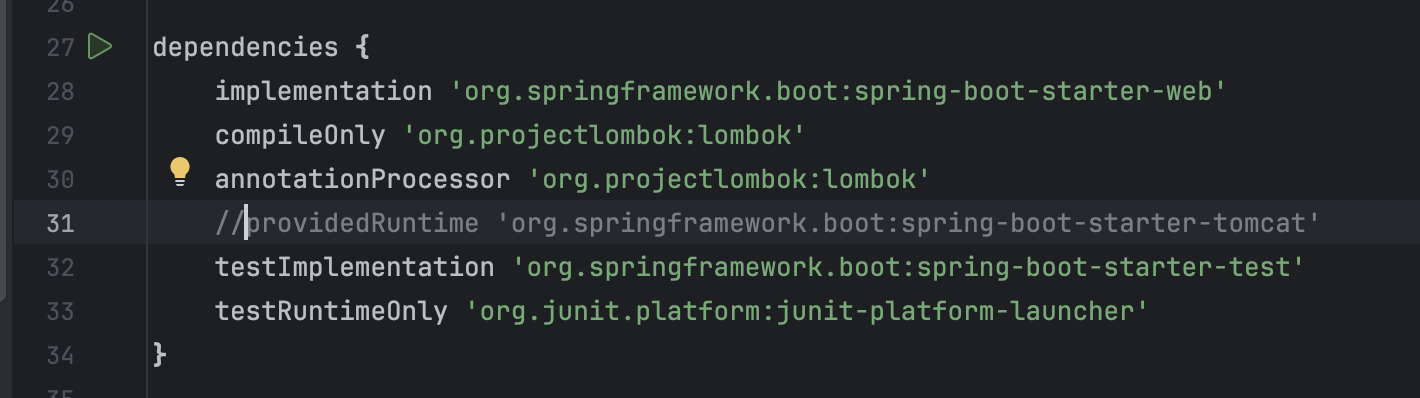 โฆ ์ธ๋ฒ์งธ ํด๊ฒฐ ๋ฐฉ๋ฒ : providedRuntime 'org.springframework.boot:spring-boot-starter-tomcat' ์ฃผ์์ฒ๋ฆฌํ๊ธฐ.