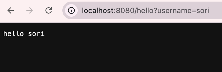 ์ฟผ๋ฆฌํ๋ผ๋ฏธํฐ๋ ? ๋ค์ ์ค๋ ๊ฒ์ด๋ค.(์์๋ก http://localhost:8080/hello?username=sori) ์ด ํ๋ผ๋ฏธํฐ๋ฅผ ์ฝ๊ฒ ์ฝ์ ์ ์๋๋ก ์ง์ํด์ฃผ๋ ๊ฒ์ getParameter๊ฐ ํ๋ ์ญํ ์ด๋ค. getParameter๋ ์ฟผ๋ฆฌ ํ๋ผ๋ฏธํฐ๋ฅผ ๊บผ๋ด์ค๋๋ฐ ๊บผ๋ด์จ ๊ฒ์ username์ ๋ฃ์ด ์ถ๋ ฅํ๋ค.