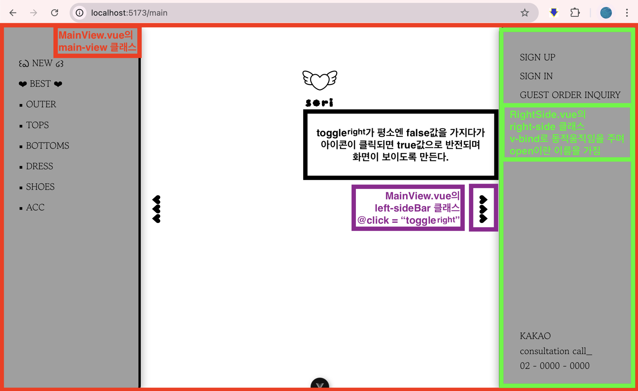 @Click="toggleRight"๋ ์ด๋ฏธ์ง๋ฅผ ํด๋ฆญ ์ MainView์์ toggleRight( ) ๋ฉ์๋๊ฐ ์คํ๋๋๋ก ํ๋ค.